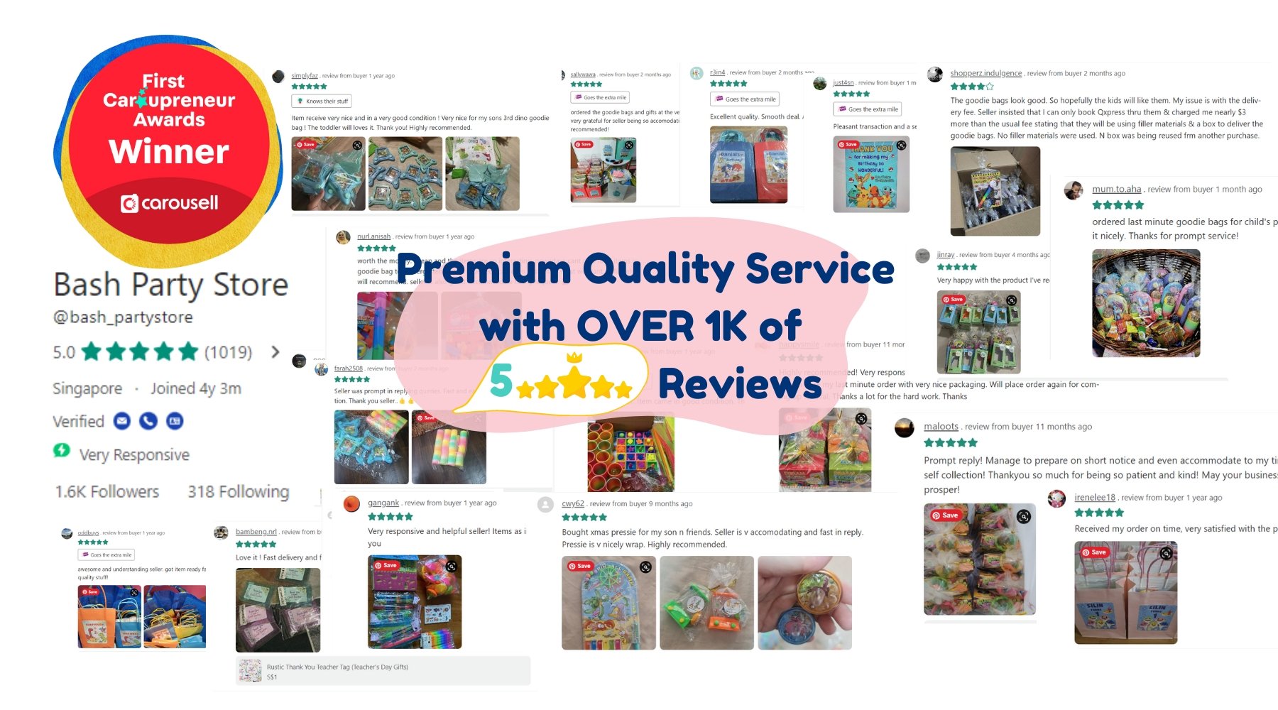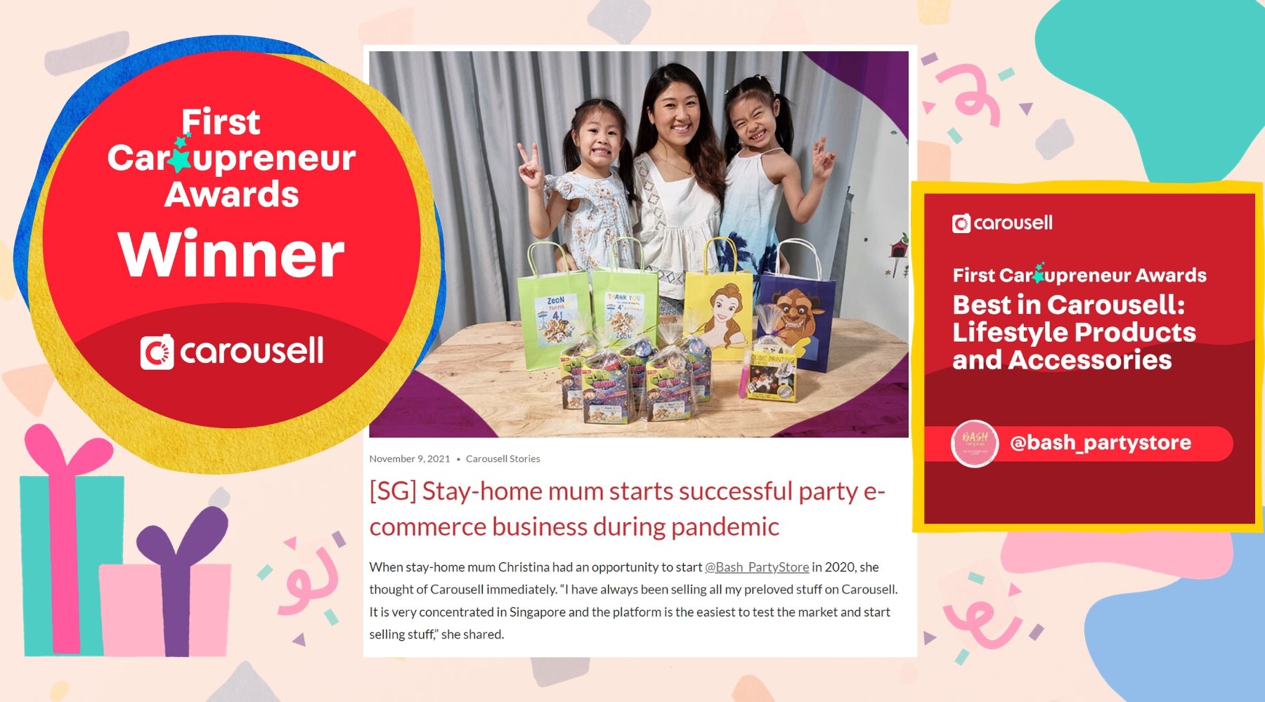 Bash Party Store was founded by Christina, a mommy of 3 children, during the early days of Covid-19 in 2020. The business first started operating only on Carousell Singapore and has even won the First Caroupreneur Award under the Lifestyle Products and Accessories Category. Read more here.